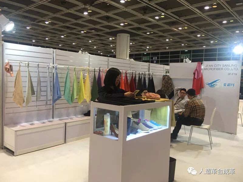 另一家新出现的公司是东莞熙锐新材料有限公司。 据本刊了解,目前市场至少出现了七家以上的有机硅皮革及相关厂家了。而且还有几家正在开发或调查中。 3,真皮纤维制革 虽已称不上新产品了,但自从耐克推出相关产品flyleather后,引来市场对此产品的更大关注。已连续多年参展的江阴骏华公司的展台持续保持高人流量,据该公司介绍,该产品已批量运用在汽车后市场座套,沙袋革,手袋革,休闲鞋等产品中。尤其是超纤与该产品的贴合可达到最佳效果,但价格也不菲。 骏华展台 其他还有十多家PVC,PU革工厂和贸易商参展,列举如下: 山东泽辉 擅长于球革的山东泽辉新材料公司还赞助本届展会的代表证吊带广告 福建益康制革 安徽宝博合成革
